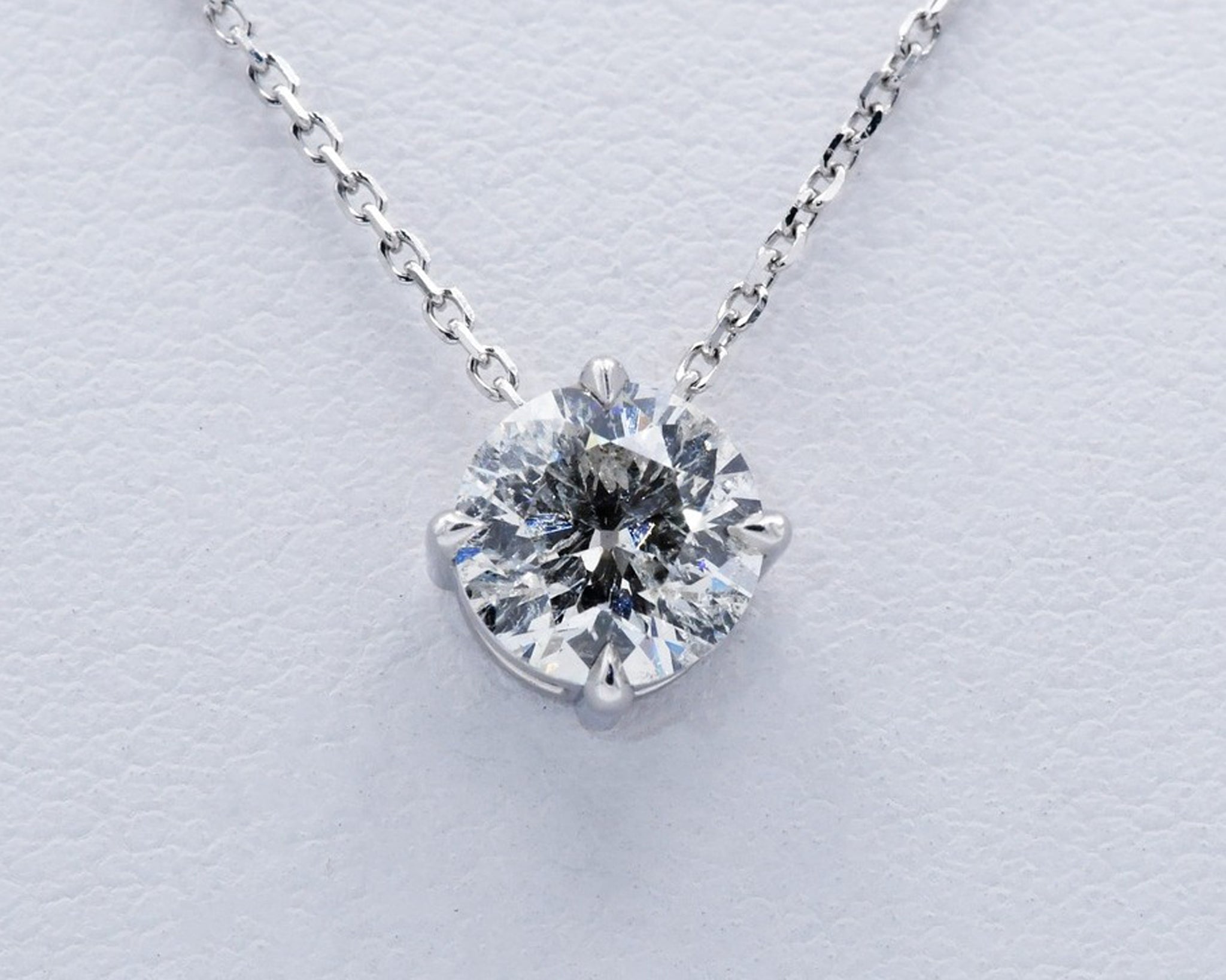 14K white gold diamond solitaire pendant necklace featuring a 1.01CT I1-I round brilliant cut diamond. The diamond is compass set with four claw prongs and hangs on an 18" diamond-cut cable chain with a lobster claw closure.