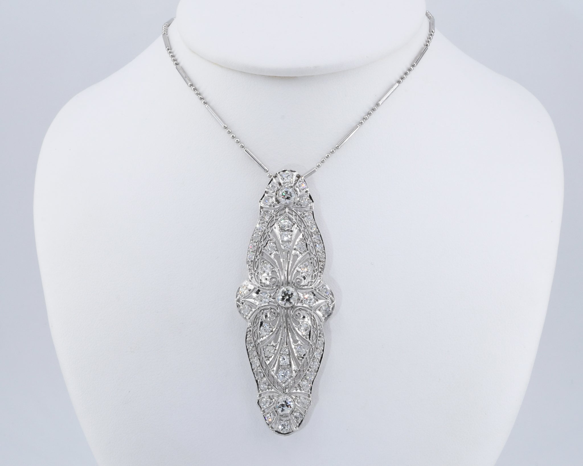 Platinum and diamonds Edwardian brooch. This brooch features 3.00CTW Old European cut and Old Mine cut diamonds. Three of the larger diamonds are set in the center and at the sides. They are bezel set surrounded by milgrain, with the center diamond being the largest. The rest of the diamonds in the pin are prong and bead set. The diamonds range from H-M in color and SI1 to I1 in clarity. The detailing of this pin includes cut outs, scrolls, filigree, and milgrain and is truly a stunning piece of history.