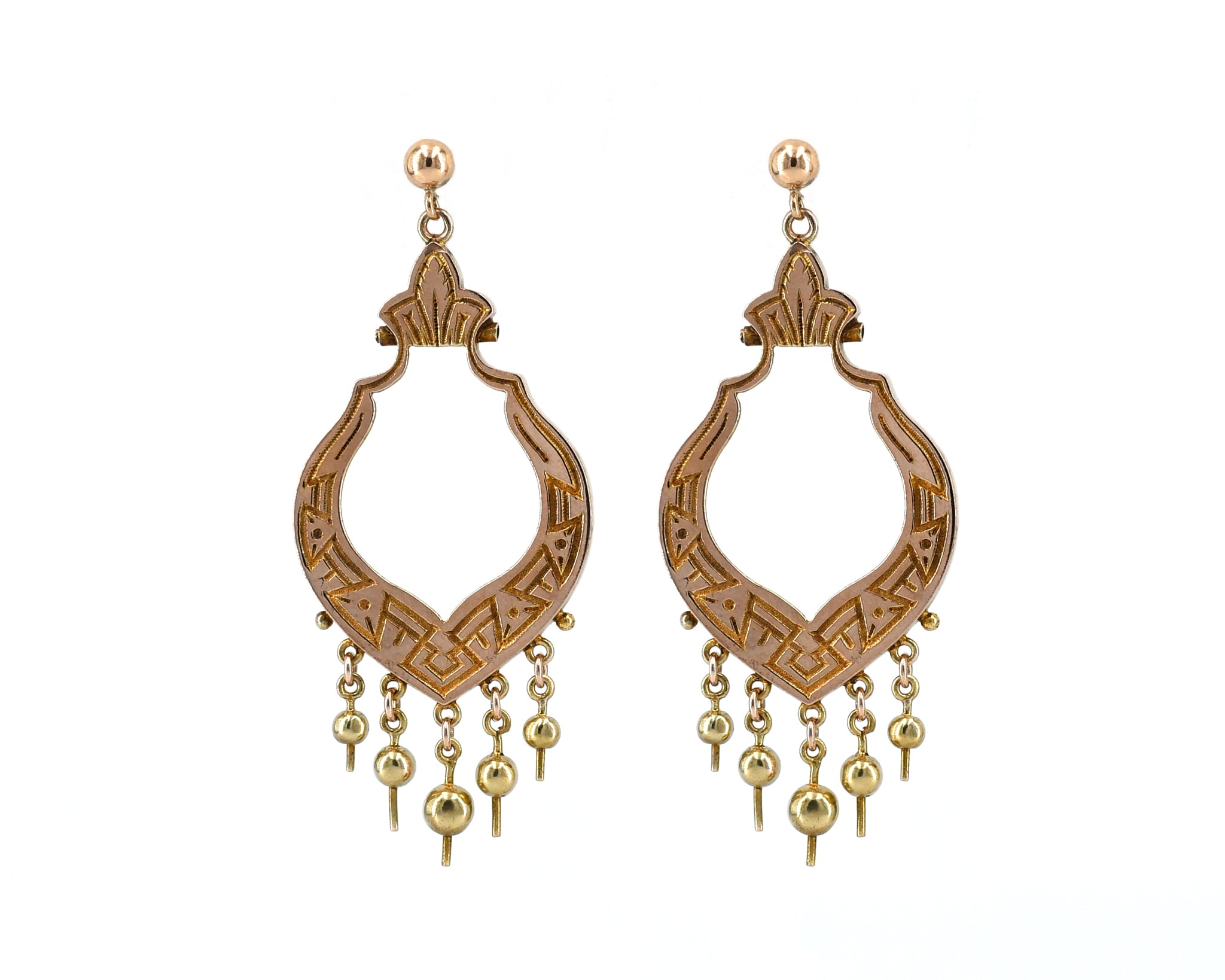 Antique Victorian 10K yellow gold dangler earrings with 14K yellow gold ball studs and push backs. This earring features a large cut out at its center, carved detailing, and dangling beads.